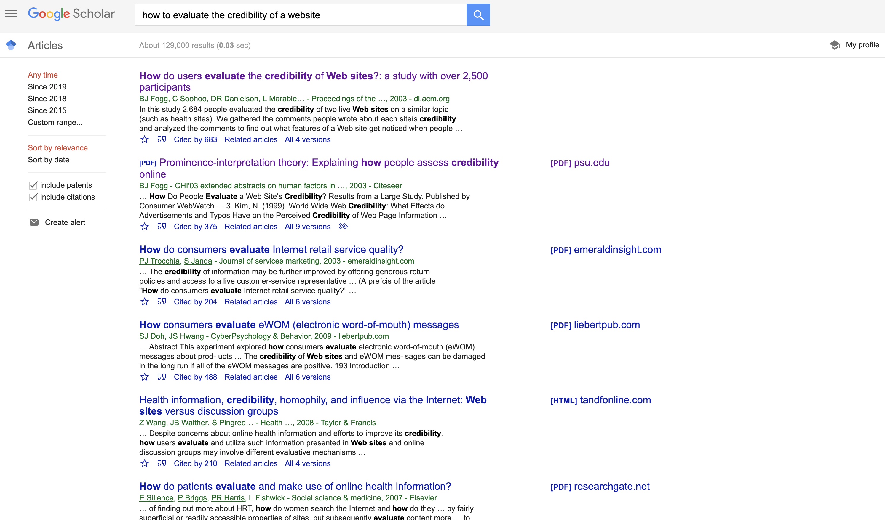 Fogg (2003) states that “credibility can be defined as believability”. It is highly important that individuals evaluate credibility- or believability- of websites. If the credibility of websites are in fact not evaluated we could be obtaining in actuate and false information and hence this could continue if not acted upon. Therefore it is vital for individuals to evaluated the credibility of the sources they collect information from on the internet. This is achieved by looking for logos and hints that the website legible and created by real website creators, author or organisation, further research into authors education and qualification to discuss the particular topic.