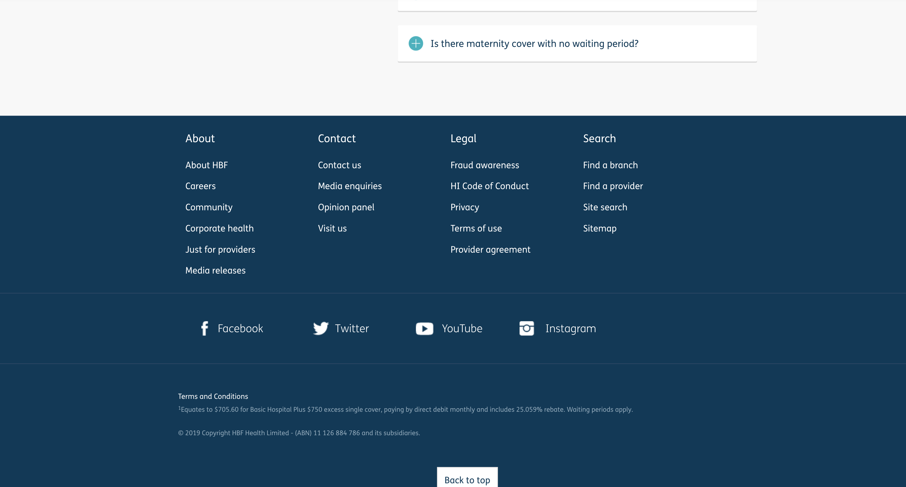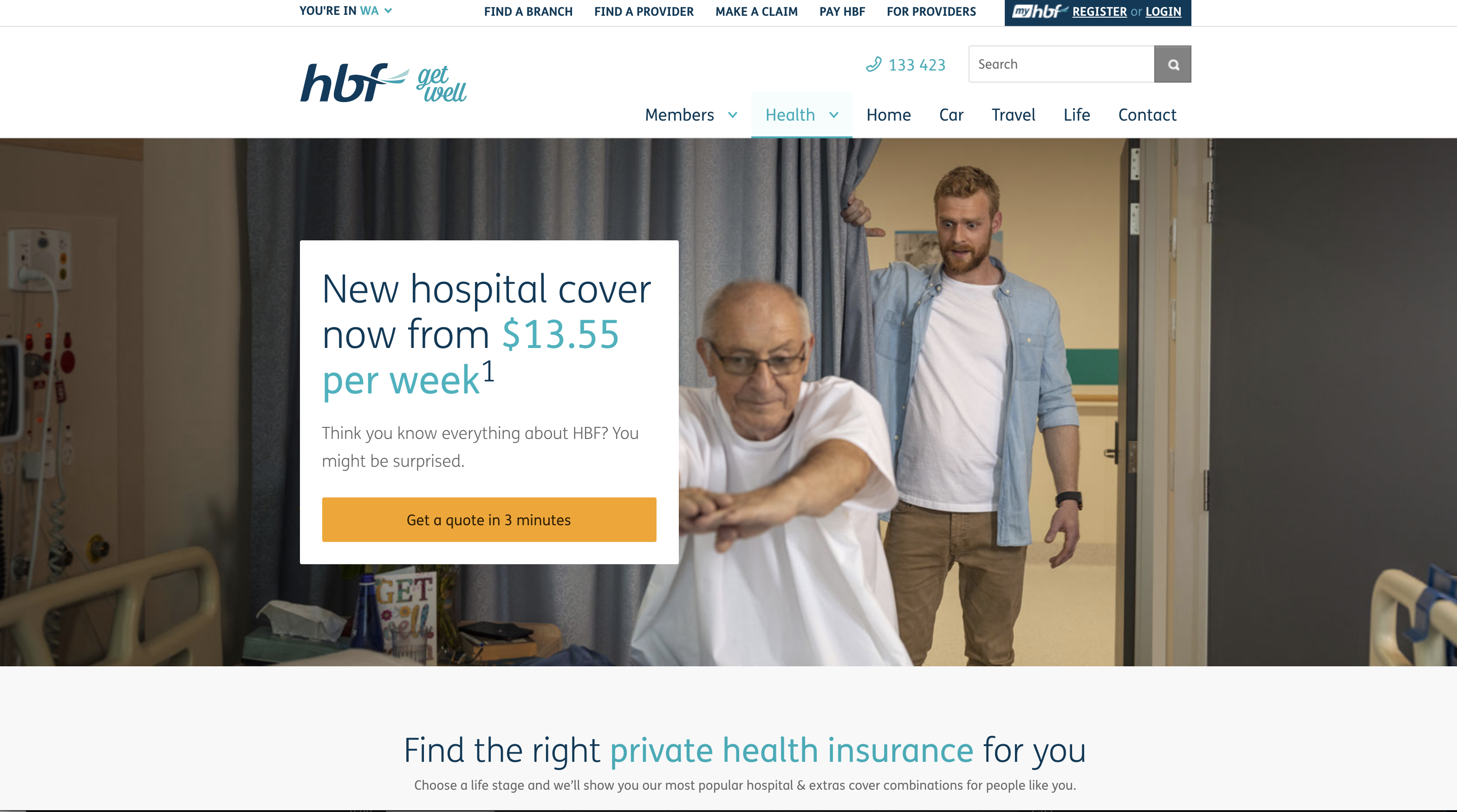 HBF Private Health Insurance (2016). HBF Homepage. Retrieved from https://www.hbf.com.au/health-insurance?cmpid=sem:goo:241272748041&s_kwcid=hbf&kwmt=%7bmatch%20type%7d&ds_rl=1239524&ds_rl=1239524&ds_rl=1239524&gclid=Cj0KCQjwxMjnBRCtARIsAGwWnBPDyHStTO3pT-w78qwyJiO5FyPDCTQOhwNtMgWk2xcVKGsoM7obrtgaAh2xEALw_wcB&gclsrc=aw.ds